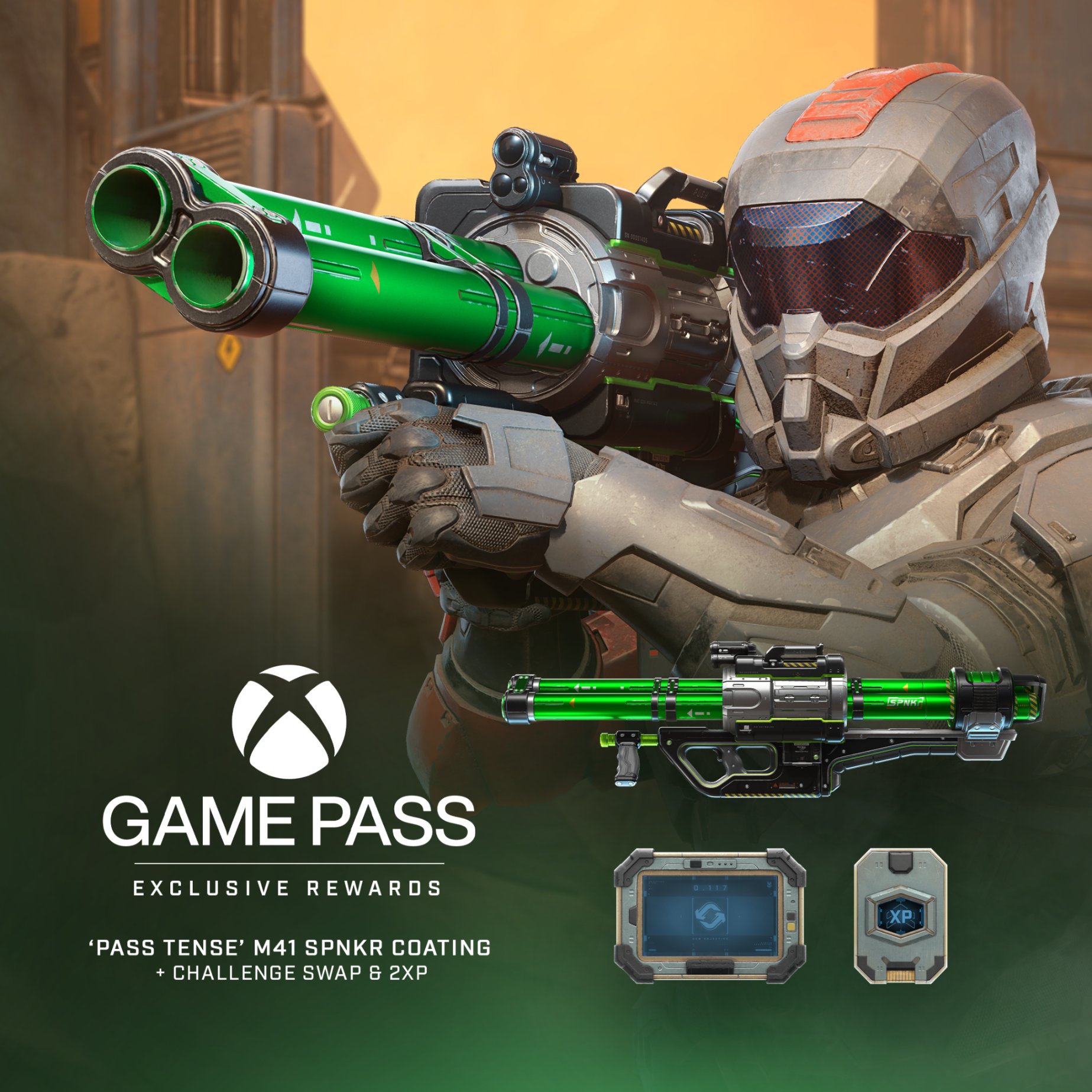 | « | It's time to refresh your armory, Spartans! With @XboxGamePass Ultimate Perks you're set and ready to get monthly #HaloInfinite multiplayer bonuses, including this month's Pass Tense coating for your M41 SPNKr. Claim it now via the Perks gallery on your Xbox console or PC. |