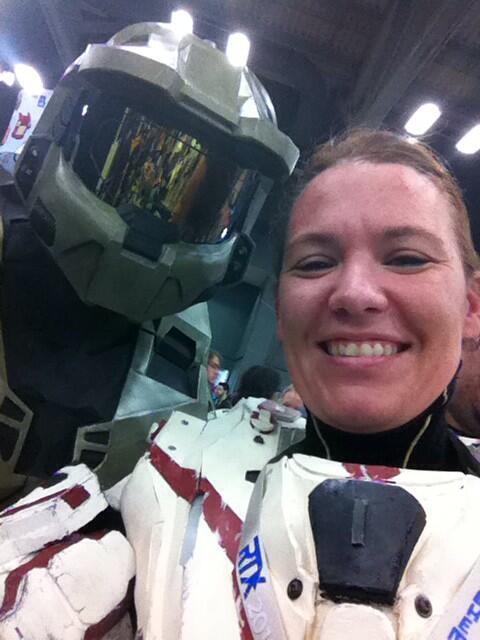 "Tweet: Sara: My first cosplaying experience... I had to get the selfie! #Halo #ChiefSelfie #RTX2014"