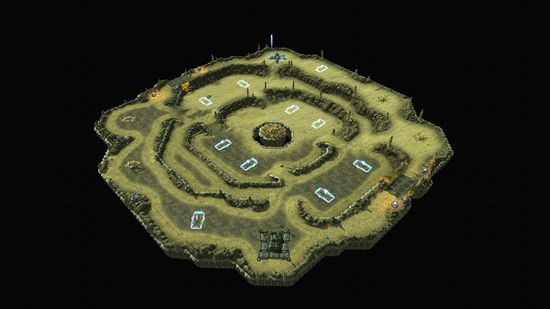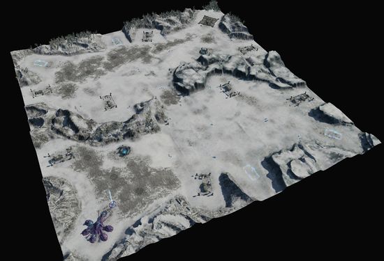 Exile was one of the maps we created toward the end of the development cycle, so we pretty much knew going into it what kind of things to avoid.Since 3v3 maps are our worst performance maps, due to the amount of units it could have on screen at any given time, we knew this maps had to be pretty simplistic. Minimal use of terrain objects/vegetation and no water/lava, which actually worked out nicely since the setting was to represent a lifeless, dried up planet.