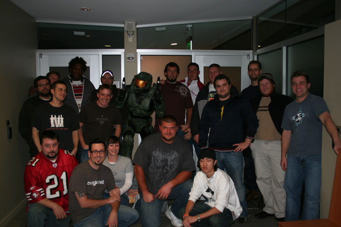 Even though very, very bad things happened to the San Francisco 49ers (if you ask them, at least. Test Manager Jamie Evans was thrilled with what went down) in their Monday night game against the Seattle Seahawks this week, we’d like to think that the 49ers that stopped by at Bungie Studios had a pretty good time on Sunday night. Five offensive lineman (Adam Snyder, Tony Wragge, David Bass, Joe Staley and Kwame Harris) for the San Francisco 49ers came by the studio for pizza and cold refreshment, fellowship and most importantly, playing new Halo 3 maps.
