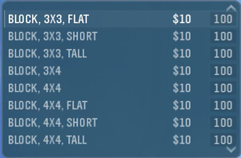 Note: Typically, when you see a large number associated with a single object, it's a group tally. For example, you can't use 100 of each and every block simultaneously. When you place a 1x1, the tally for all objects in that category will decrement by one.