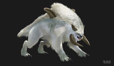Avant d'être reprise dans le roman Halo : Les Chasseurs dans l'ombre, cette créature devait faire partie de la faune dans Halo Wars mais fut supprimée de la version finale du jeu. Ses concept arts lui donnent le nom générique Arctic Beast.