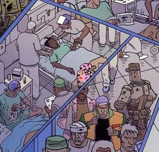Les bornes médicales Optican en libre-service permettent aux civils de soigner rapidement les blessures bénignes.[13] Le port de lunettes reste courant même si la plupart des problèmes de vue peuvent être résolus médicalement,[92] probablement grâce aux fonctions d'affichage intégrées aux lunettes.[93]
