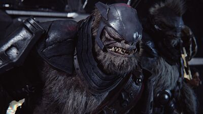 Jiralhanae, named Brutes by humans, are a large, muscular pseudo-ursine sentient species predisposed to feral behavior. Their home planet Doisac yielded numerous predators throughout its evolutionary history, has aberrant terrestrial conditions and is roughly twice the gravity of Earth. This challenging but diverse environment forced the species to develop from fur-covered, temperamental, tree-dwelling savages into an aggressive species of pack hunters. Jiralhanae are incredibly strong and fast, with highly sensitive olfactory glands, enabling them to hunt down prey quickly even in unfamiliar environments. Without grooming, Jiralhanae become covered in a thick, matted fur which can vary in color but is most commonly brown or black. Beneath their fur is a tough, leathery skin. They have three fingers and an opposable thumb on each hand, with large cloven-toed feet bearing thick, hardened claws.